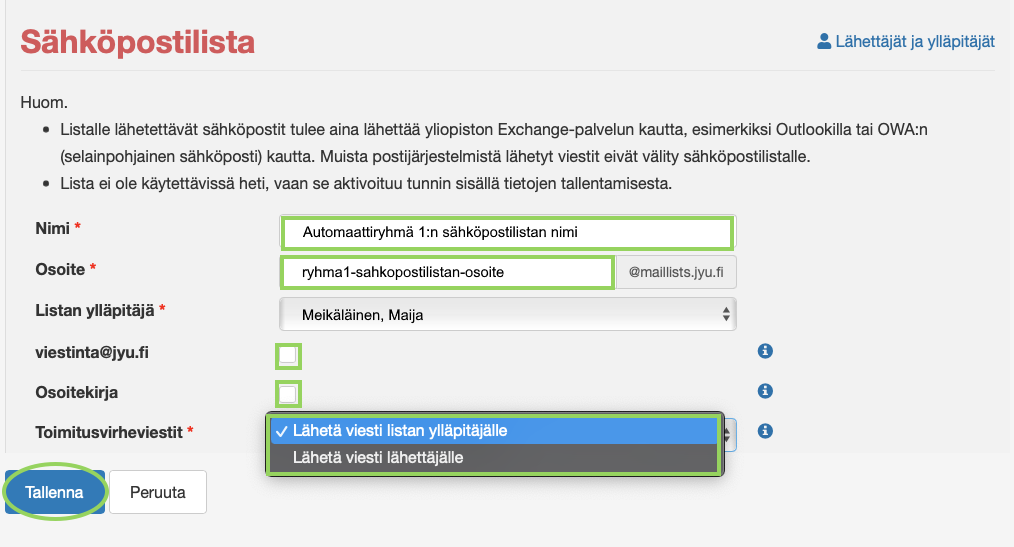 HUOM! Muutokset listojen jäseniin ja oikeuksiin päivittyvät viiveellä jos yrität käyttää listaa sähköpostillasi. Tämä viive on maksimissaan yksi tunti.