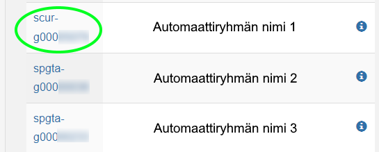 Valitse avatuvasta listanäkymästä mitä automaattiryhmää haluat muokata. Automaattiryhmästä saa lisätietoa klikkaamalla (i)-painiketta rivin oikeasta laidasta.