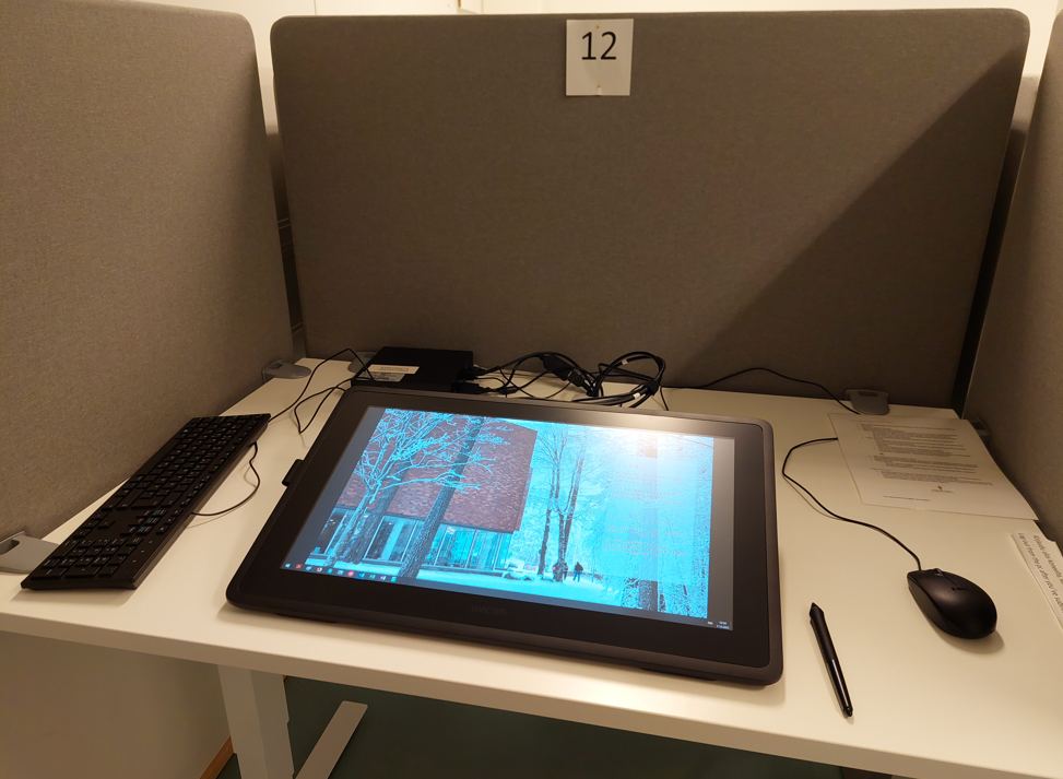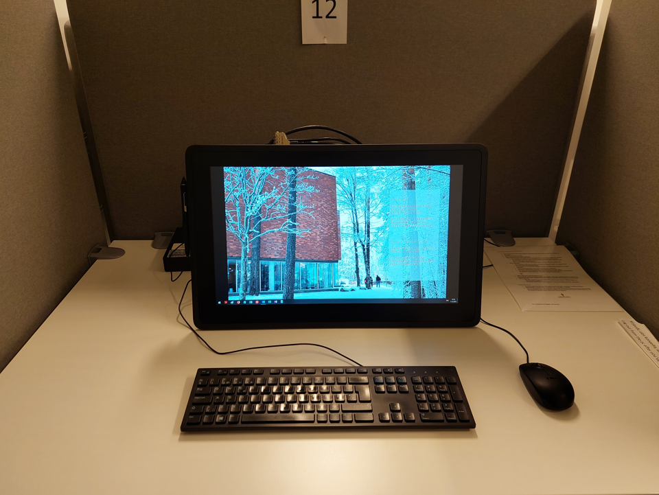 Voit myös muokata työskentelytilaa sopivaksi. Voit näytön kulmaa säätämällä vaikuttaa näyttöön, mutta voit myös siirtää näyttöä lähemmäksi ja voit siirtää näppäimistön ja hiiren sivummalle. Näyttöön piirretään pelkällä piirtonäyttökynällä, joten kämmenen kosketus näyttöön ei piirrä mitään. Jos saavut tenttiin ajoissa, voit hetken ennen tentin alkua tutustua näytön käyttöön ja toiminnallisuuksiin.