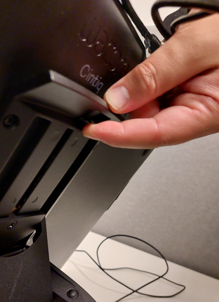 Näytön kulmaa voit muuttaa näytön takana olevan jalustan ylhäällä olevan kytkimen kautta, jonka lukituksen poistamalla näyttöä voi säätää vapaasti. Näyttö lukittuu, kun päästät kytkimestä irti ja hienosäädät näyttöä hieman. Kuulet äänestä, kun näyttö on lukkiutunut uudestaan.