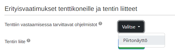 Tentaattori tulee tulee valita "Piirtonäyttö" tenttiä luotaessa. Erityisvaatimukset tenttikoneille ja tentin liitteet kohdasta Perustiedot-välilehdellä. Näin tentti on tentittävissä piirtonäytöllisellä koneella.