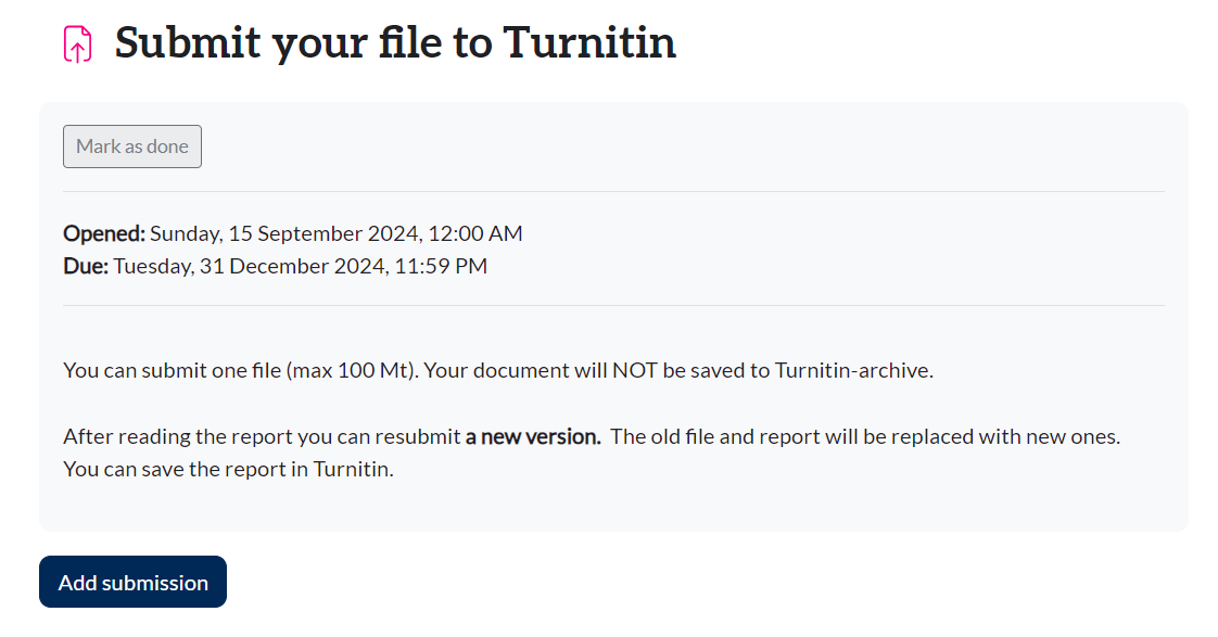 We offer two options for independent Turnitin similarity checks for postgraduate students, researchers or other staff. The Turnitin report can be generated using either the Turnitin Draft Coach or a dedicated Moodle course area.