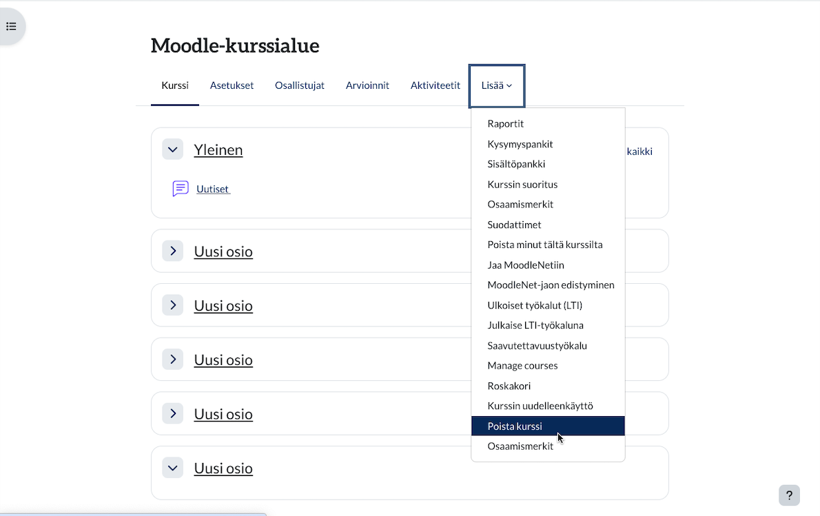 Moodle-kurssialueelta löytyy opettajan näkymästä otsikon alapuolelta valikko Lisää > Poista kurssialue