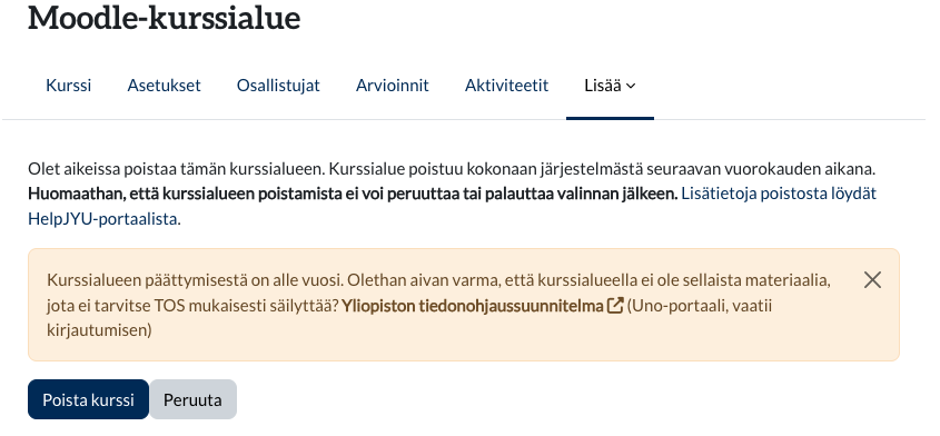 Varmistussivulla kerrotaan, että olet aikeissa poistaa kurssialueen. Jos kurssialueen päättymisestä on alle vuosi, tulee näkymään huomautus siitä, että olethan varmistanut ettei kurssialueella ole TOS mukaisesti säilytettäviä töitä. Klikkaamalla Poista kurssi kurssi siirtyy poistettavaksi. Voit myös peruuttaa poiston vielä tässä vaiheessa valitsemalla peruuta.