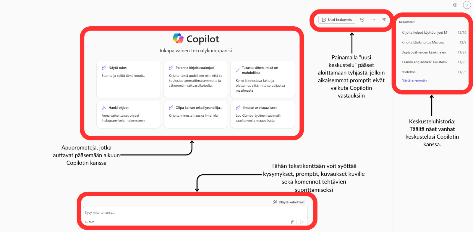 Kerro, mitä haluat tietää tai mitä tehtävää haluat Copilotin suorittavan. Esimerkiksi: "Voitko auttaa minua kirjoittamaan sähköpostin?" tai "Mikä on sää tänään Helsingissä?"