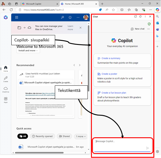 Promptaaminen tarkoittaa tekoälylle annettujen ohjeiden tai kysymysten muotoilua. Hyvin muotoillut promptit auttavat Copilotia ymmärtämään tarpeesi paremmin ja tuottamaan tarkempia vastauksia. Prompaus tapahtuu Copilotin tekstikentässä.