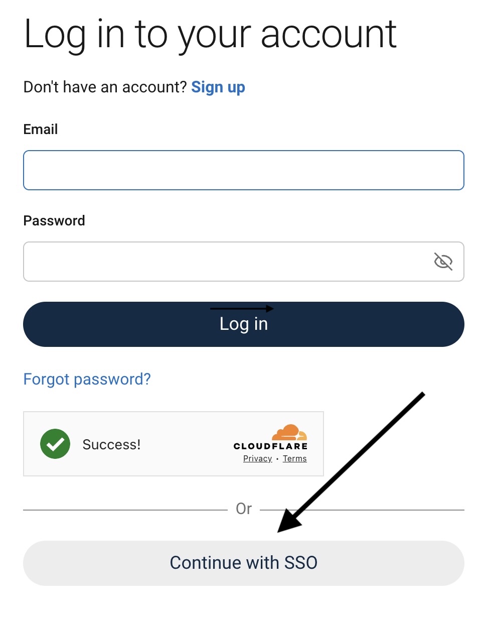 Kirjautumismuodoksi, valitse "Continue with SSO".
