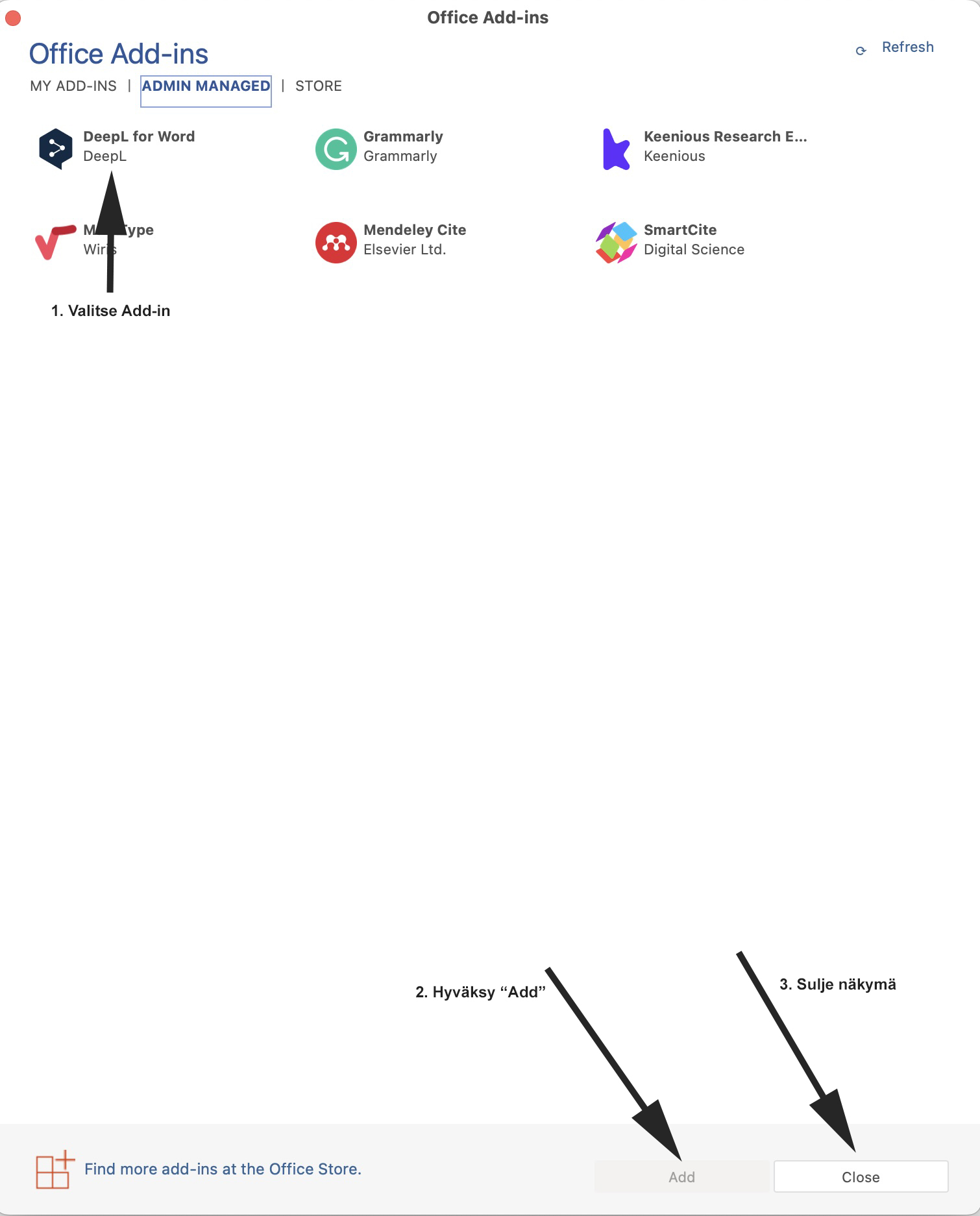 Valtise seuraavaksi "DeepL for Word (tai PowerPoint tai Outlook)", 1. Napauta "Add" ja 2. sulje näkymä napauttamalla "Close"