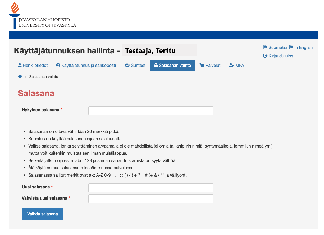Salasanan vaihto välilehdeltä voi vaihtaa salasanan. Noudata sivulla kerrottuja ohjeita kun vaihdat salasanaa. Kun edellinen salasana, uusi ja sen vahvistus on kirjoitettu tulee muistaa painaa Vahvista salasana -painiketta sivun alaosassa.