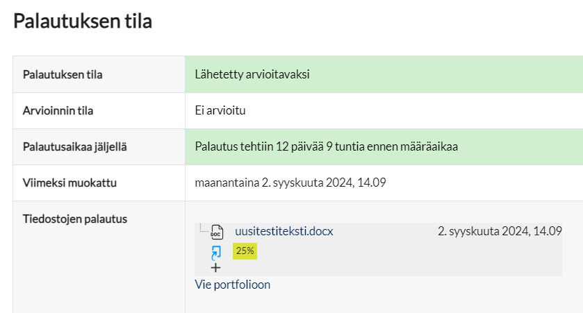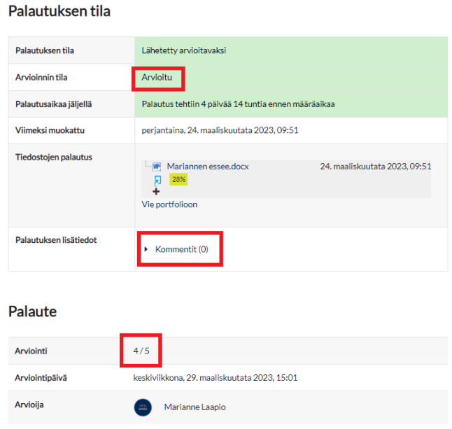 Jos tehtävä aktiviteetissa palaute ja arviointi on annettu tehtävä aktiviteetin työkaluilla, palaute näkyy palautuksen tilan tietojen alapuolella.