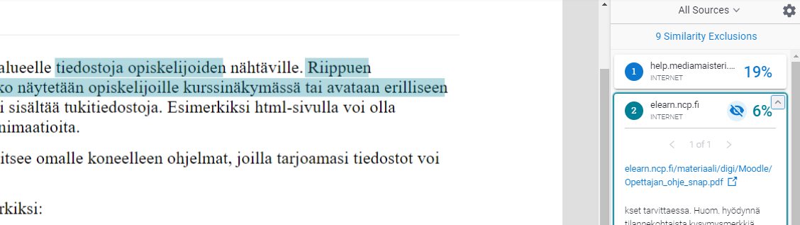 Raportissa oikealla näkyy ne lähteet, johin on samankaltaisuutta löytynyt. Eri lähteet näkyy tekstissä eri väreillä, kun lähdettä klikkaa auki tarkempaan tarkasteluun.