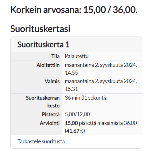 Tentissä pisteet ovat tentin Yhteenveto-näkymässä ja Turnitin raportin pääset lukemaan valitsemalla Tarkastele suoritusta ja esseetehtävän alapuolelta näkyy Turnitin löytämä samankaltaisuusprosentti, jos opettaja on asettanut suorituksen näkyviin.