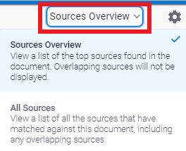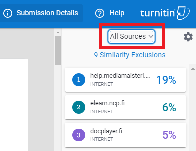 Saat näkyviin kaikkien lähteiden samankaltaisuusprosentit valitsemalla Source Overview -valikosta Kaikki lähteet/All sources -näkymän.