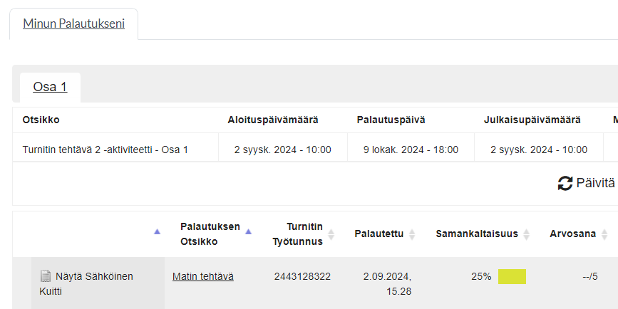 Avaa Turnitin tehtävä 2 ja klikkaa palautusrivillä olevaa prosenttilukua tai vieressä olevaa väripainiketta.