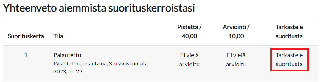 Avaa tentti-aktiviteetti, jossa on ollut esseee tehtävä Turnitinilla, valitsemalla suorituskerroista Tarkastele suoritusta.