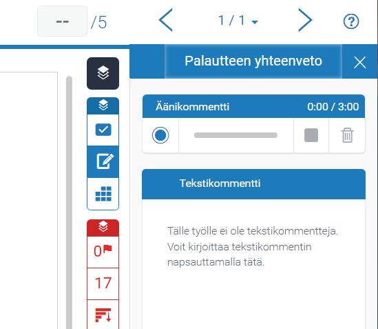 Voit lukea opettajan yleispalautteen työstä tekstinä tai kuunnella äänitiedostona klikkaamalla sinistä puhekupla -painiketta.