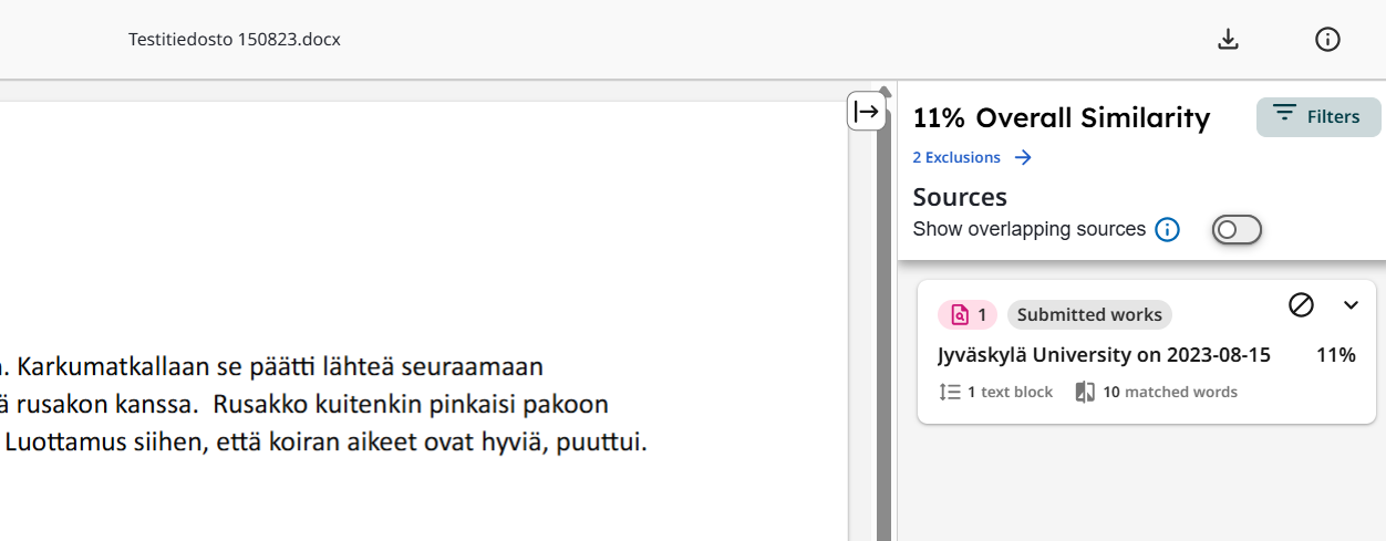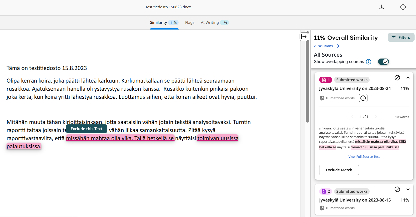 Opettaja voi halutessaan suodattaa lähteitä pois raportista, jos esimerkiksi samasta työstä on palautettu kaksi versiota. Lähteen nimeä klikkaamalla Turnitin raportissa näkyy ko lähteen samankaltaisuudet lähteen värillä merkittynä.