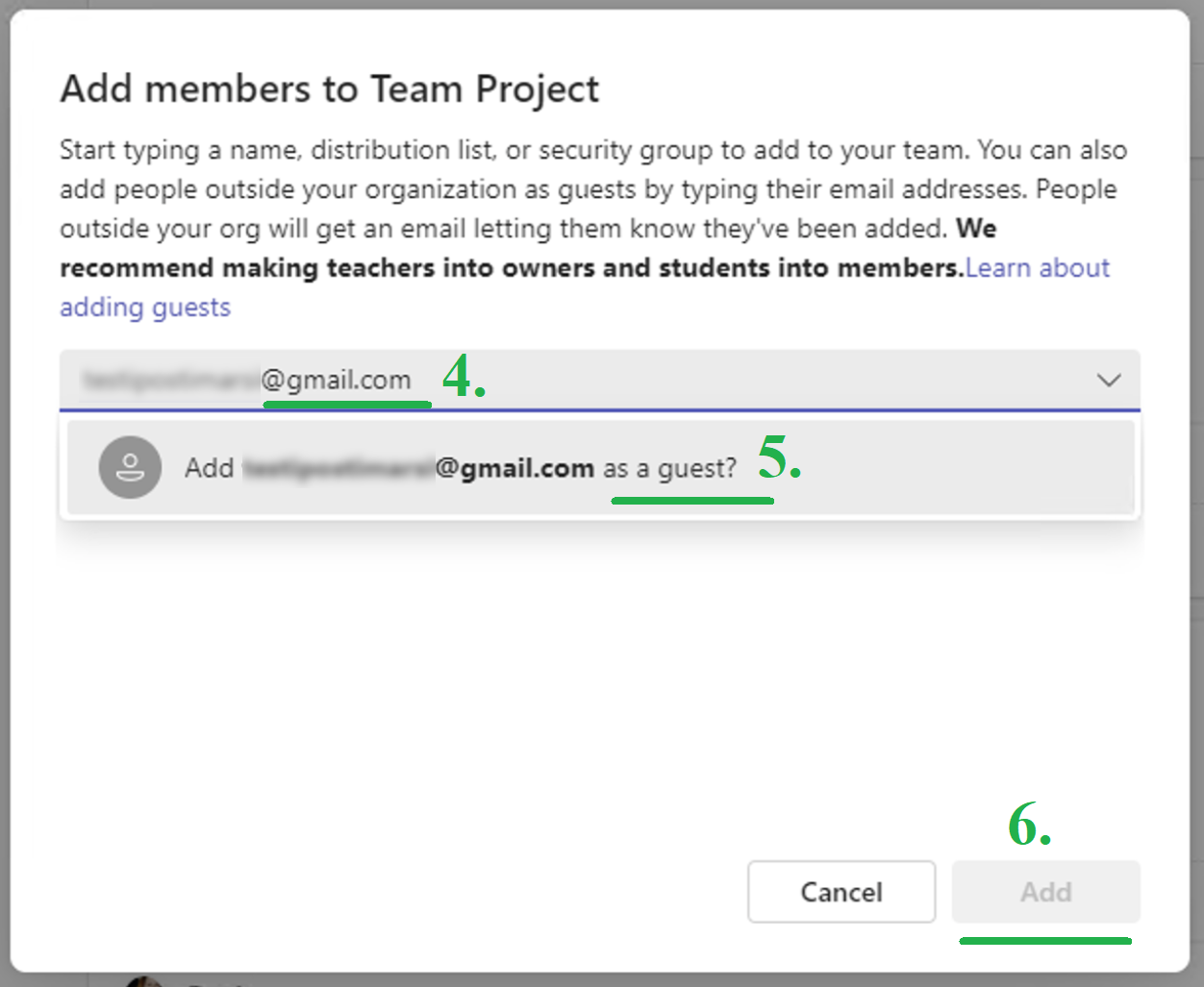 Kutsu vieras Teams ryhmääsi hänen sähköpostiosoitteellaan. Varmista vierailijalta millä sähköpostiosoitteella hän haluaa tulla kutsutuksi. Kyseisen sähköpostiosoitteen tulee olla Microsoft tili, tai vierailijan rekisteröi sähköpostiosoitteensa Microsoft tiliksi kutsun vastaanottamisen yhteydessä.