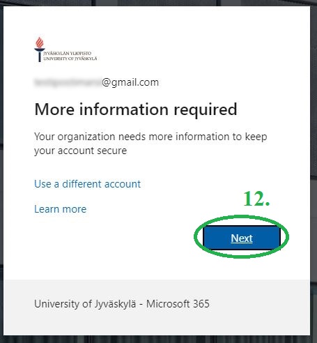 12. Kun olet hyväksynyt käyttöoikeudet, on aika ottaa monivaiheinen tunnistautuminen käyttöön. Ota Microsoft Authenticator käyttöön kirjautuaksesi vierailijana Jyväskylän yliopiston Teamsiin: Microsoft MFA:n pakotettu käyttöönotto Teams (guest)