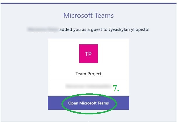 7. Klikkaa Teams kutsussa olevaa painiketta