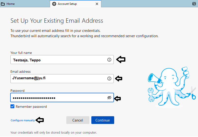 1. Anna tietosi, eli koko nimi sekä sähköposti muodossa JYtunnuksesi@jyu.fi sekä JY-tunnuksen salasana. Klikkaa lopuksi "Configure manually".