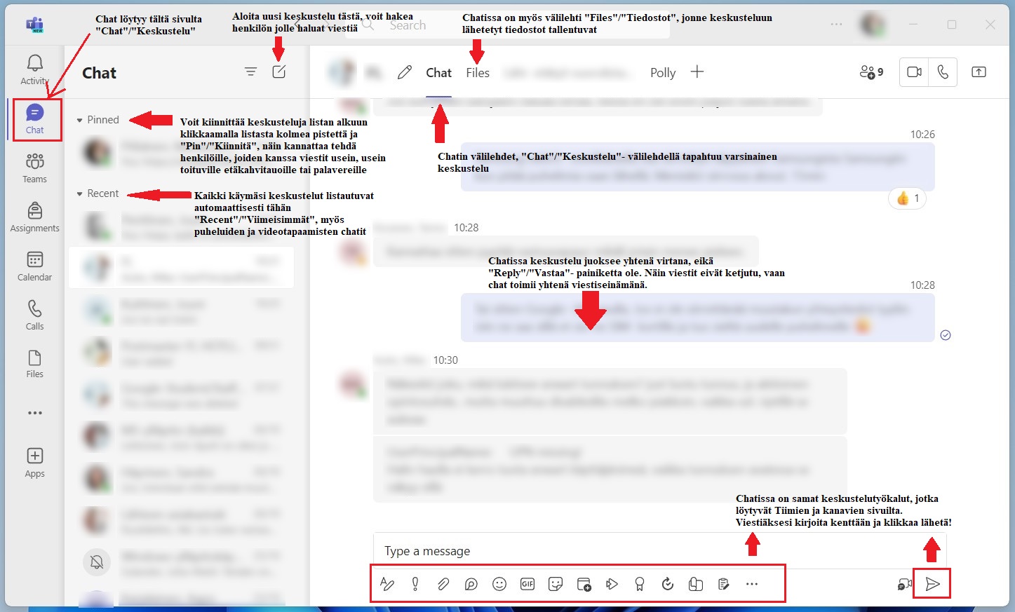 Chat-sivua suositellaan käytettäväksi ensisijaisesti yksityisviestien lähettämiseen ja kahdenkeskeisten keskustelujen käymiseen. Muissa tapauksissa Teams-tiimit ja niiden kanavat on parempi paikka viestiä isomman porukan kesken. Chatin kautta voi kuitenkin viestiä useammalle henkilölle; jos esimerkiksi jossain HR-asiassa täytyy olla yhteydessä samaan aikaan esimiehelle ja sihteerille, voi keskustelun aloittaa näiden kahden henkilön kanssa Teamsin chatissa sähköpostiketjun sijaan.