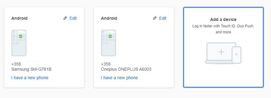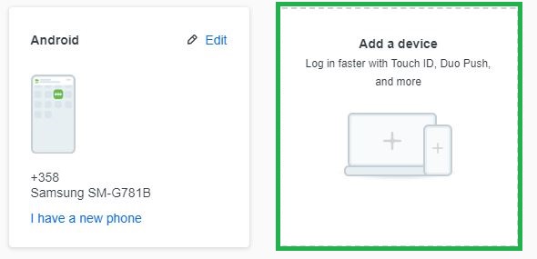 Step 2: You will be taken to a page where you will find your current phone with Duo Mobile connected. To add another phone next to it, click on "Add a device".