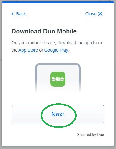 Step 6: Take your phone to your operating system specific store (either the App Store or Play Store) and install the "Duo Mobile" app on your phone. Once you have installed the app, click the "Next" button.
