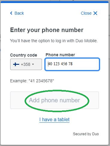 Step 4: Enter the phone number of the phone you want to connect Duo Mobile to. Also select the Finnish flag (+358). The "Add phone number" option will become active once you have entered your phone number.