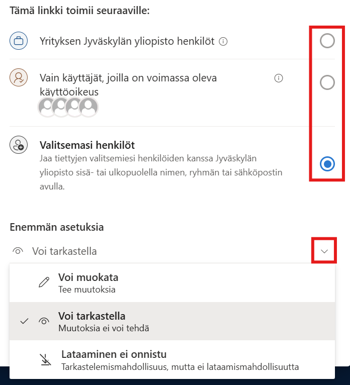 Materiaalit pysyvät kuitenkin tiimin sisäisinä sielläkin, ellei niitä haluta jakaa. Jakaminen onnistuu Sharepointissa yksittäiselle henkilölle tai ryhmälle. Sekä yksittäisen henkilön ja ryhmän käyttöoikeuksia voidaan muuttaa tiedostokohtaisesti. Tiedoston omistaja voi valita, voivatko muut tarkastella, kommentoida vai muokata tiedostoa. Tiedostossa tapahtuvat lisäykset, muokkaukset, kommentit ym. näkyvät reaaliaikaisesti sekä Teamissä että Sharepointissa.