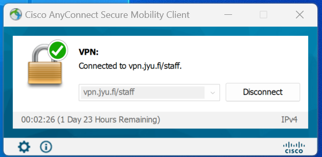 4. The connection is successful when the program says "Connected to vpn.jyu.fi/staff". A lock image appears over the globe icon.