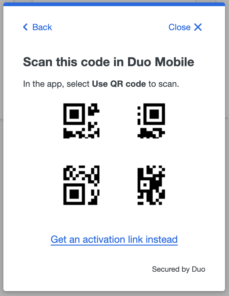 6. Activate Duo Mobile by scanning the QR code (note: not the QR code in the guide) displayed on the screen with the QR code reader in the DUO app. Open the Duo app from your phone and press "Use a QR code".