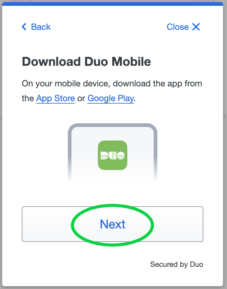 3. Next, the program will ask you to download the Duo Mobile app to your phone. You can download the app from the Google Play store or the Apple App Store. Once you have downloaded the Duo Mobile app to your phone, continue on your computer by pressing "Next".