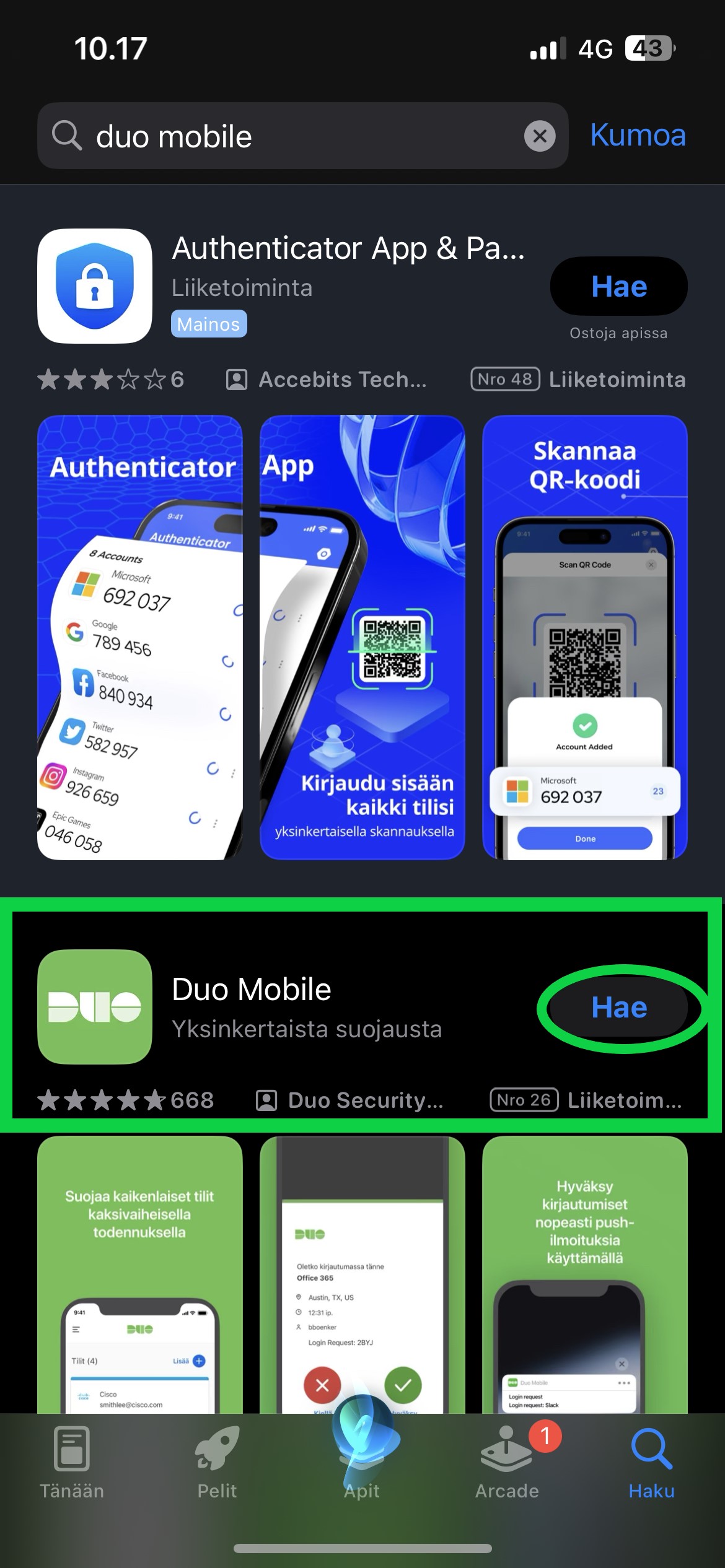 Note! The Google Play store and Apple App Store will always be the first to suggest a "paid ad" app. Be careful to download the right app. You can recognise Duo Mobile here: