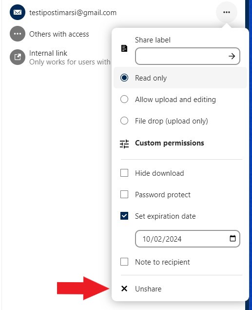 Nyt vastaanottajan sähköpostiosoite ilmestyy lähettäjän Share link -valikkoon. Voit säätää jaon asetuksia osoiterivin oikealla puolella olevasta pistekuvakkeesta: