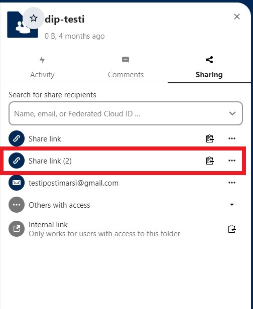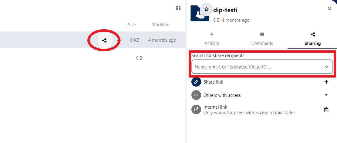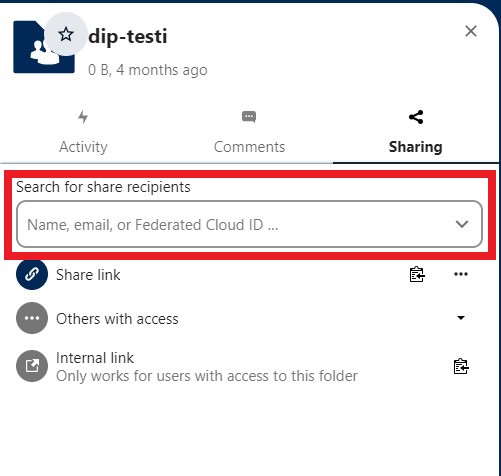 Aineistoa jaetaan Nextcloud-käyttäjien kesken suoraan etu- ja sukunimen perusteella. Aloita klikkaamalla jaettavan aineiston oikealla puolella olevaa linkkikuvaketta. Kirjoita sitten vastaanottajan suku- ja etunimi Shar elink -valikon osoitekenttään. Huomaathan, että voit syöttää kenttään vain yhden vastaanottajan kerrallaan: