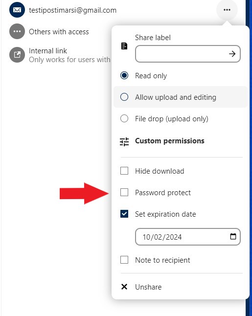 Valitse sitten avautuvasta valikosta halutut jakoasetukset. Voit poistaa vanhenemispäivämäärän tai muuttaa sitä tarpeen mukaan. Voit myös asettaa jaolle salasanan: