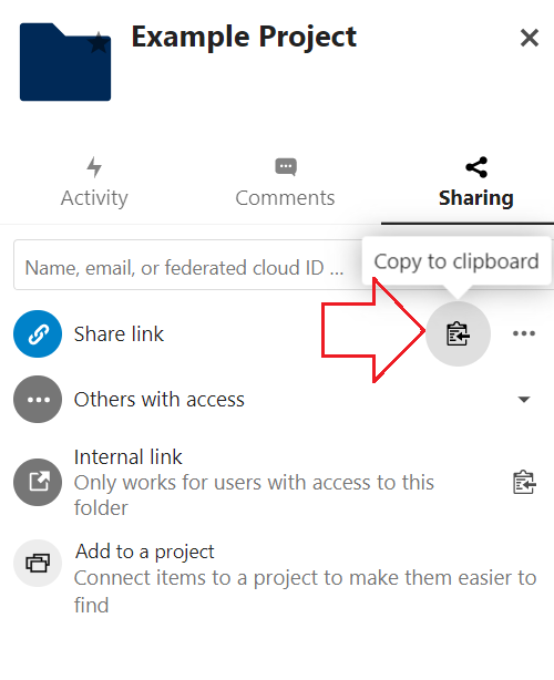 Kun vastaanottaja ei ole JYUn Nextcloudin käyttäjä, aineisto jaetaan joko yleisellä jakolinkillä, joka lähetetään vastaanottajille erikseen (ks. yllä), tai suoraan vastaanottajan sähköpostiosoitteeseen Nextcloudin osoitekentän avulla. Klikkaa ensin jaettavan aineiston oikealla puolella olevaa linkkikuvaketta. Kirjoita sitten vastaanottajan sähköpostiosoite Share link -valikon osoitekenttään: