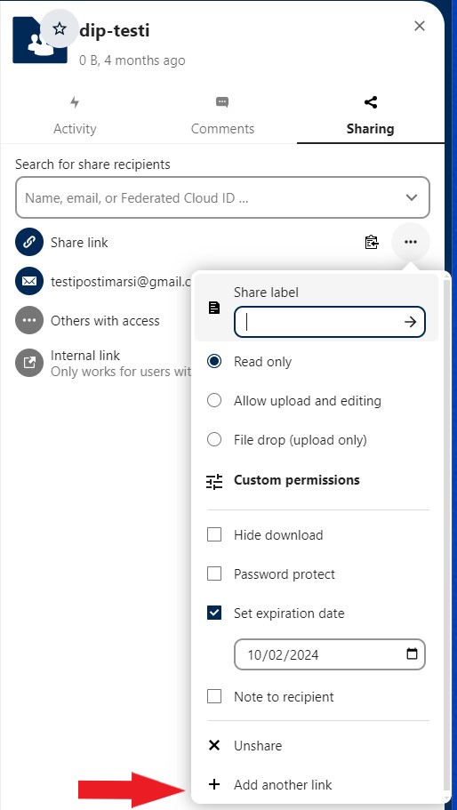 Mene jakamasi aineiston jakoasetusvalikkoon ja klikkaa 'Add another link':