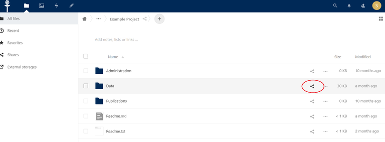 Kun olet kirjoittanut nimen, klikkaa Enter. Tällöin jako muodostuu ja jaettu aineisto ilmestyy suoraan vastaanottajan omaan Nextcloud-pääkansionäkymään.