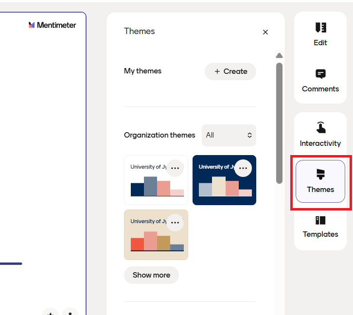 Kun olet aloittanut esityksen teon, klikkaa oikeasta reunasta Themes ja valitse sopivin pohja klikkaamalla värimalli-kuvaketta.
