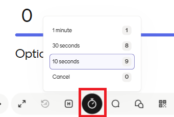 Voit näppäimistöltä valita numeron: 1,2,3... jne (enintään 10 minuuttia), jolloin ajastus alkaa heti ja on näkyvillä osallistujille.