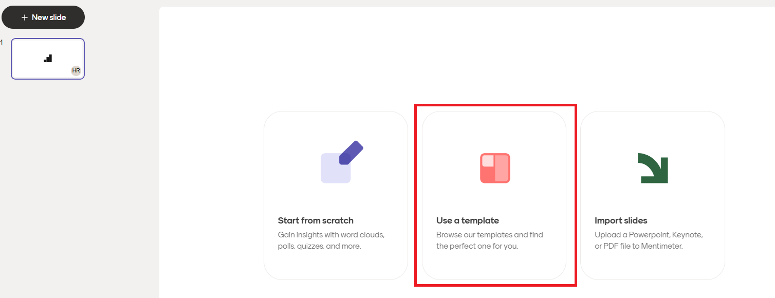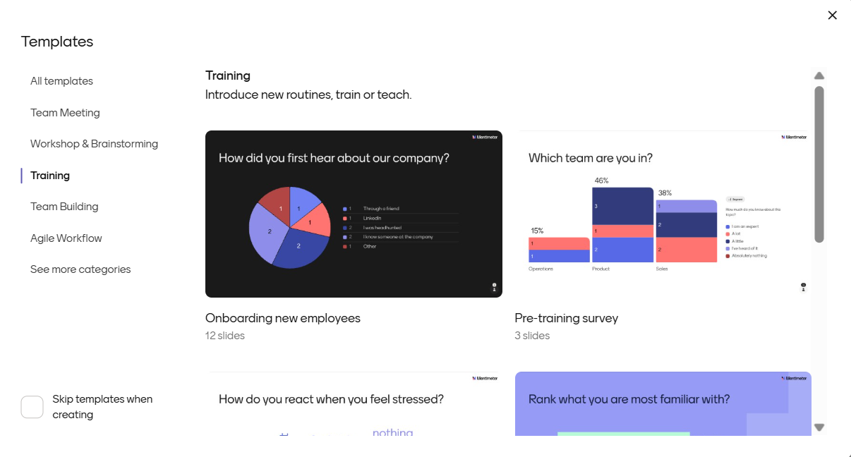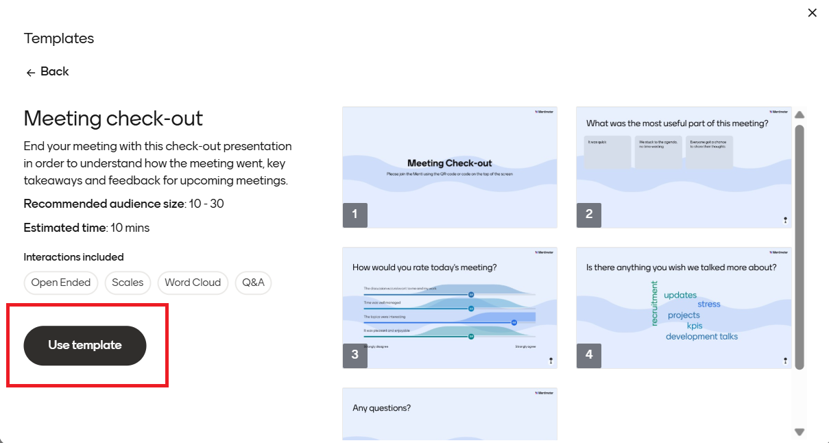 Mallipohjien avulla pääset nopeasti alkuun: kysymysdiat ovat valmiina! Voit muokata mallipohjaa ja poistaa tai lisätä uusia dioja jne. Kun klikkaat New Menti, pääset valitsemaan aloitatko tyhjän vai rakennatko esityksesi mallipohjan avulla: Use a template. Voit avata eri vaihtoehtoja, näet millaisia kysymyksiä ne sisältävät ja valita tarkoituksenmukaisimman klikkaamalla Use template -painiketta.