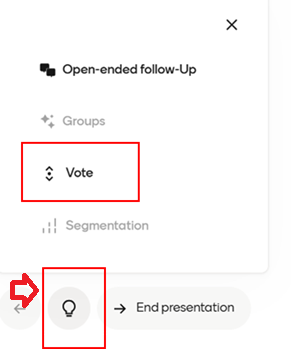 Vaihtoehtoisesti Menti-esityksen jo pyöriessä voit valita diaan äänestyksen: klkkaa alareunasta lamppu-painiketta ja valitse Vote.
