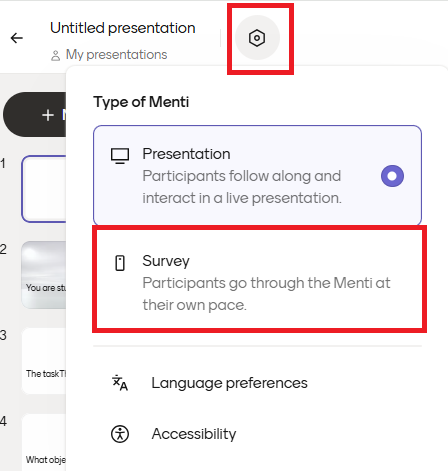 Voit lisätä Menti-kysymyksiä Powerpoint-diojesi väliin tai vaihdella PP-diojen sijaintia. Tee siis Powerpoint-esityksesi ensin valmiiksi ennen kuin lisäät Mentimeteriin.