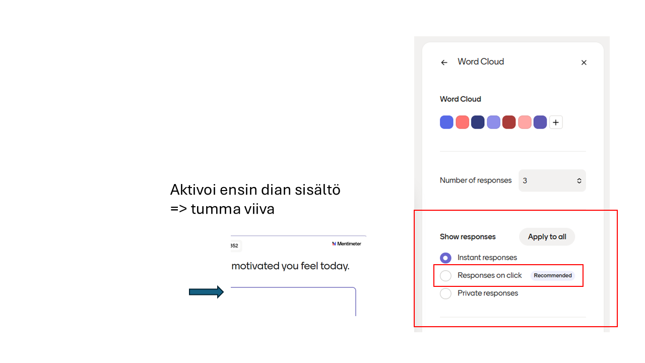 Voit myös jo esitystä luodessasi määrittää asetuksista että tässä diasssa (tai kaikissa esityksen dioissa) vastaukset ovat lähtökohtaisesti piilossa. Valitse Response on click.