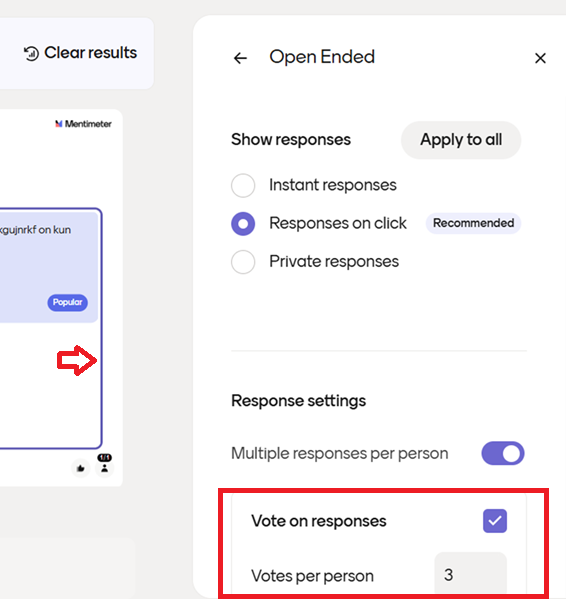 Voit etukäteen asetuksista valita Äänestyksen päälle sekä kuinka monta ääntä kukin osallistuja voi antaa. Huom. klikkaa ensin sisältökehys aktiiviseksi niin pääset valitsemaan Vote on Responses sekä kuinka monta ääntä on osallistujalla.