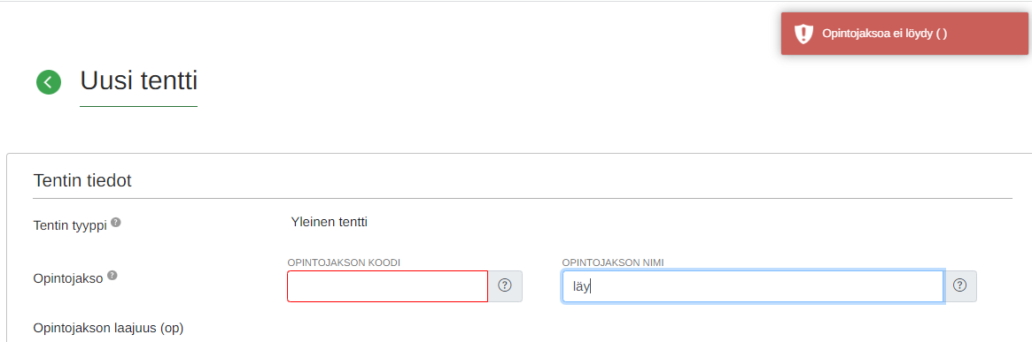 Tenttiä luotaessa, tentti tulee aina liittää tällä hetkellä voimassaolevaan tai alkavaan toteutukseen. Jos kurssia ei löydy, kun kurssin nimeä kirjoittaa EXAM-järjestelmässä Opintojakson koodi tai Opintojakson nimi kohtaan, järjestelmä ilmoittaa tästä virhetekstillä selaimen oikeassa yläkulmassa "Opintojaksoa ei löydy ()".