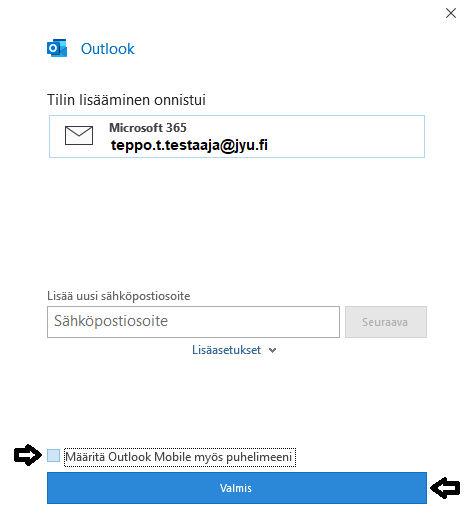 Ota raksi pois kohdasta "Määritä Outlook Mobile myös puhelimeeni" ja paina valmis. Outlook aukeaa!