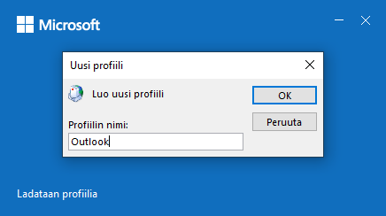 Käynnistä Outlook-sovellus ja anna uudelle profiilille nimi ja paina ok: